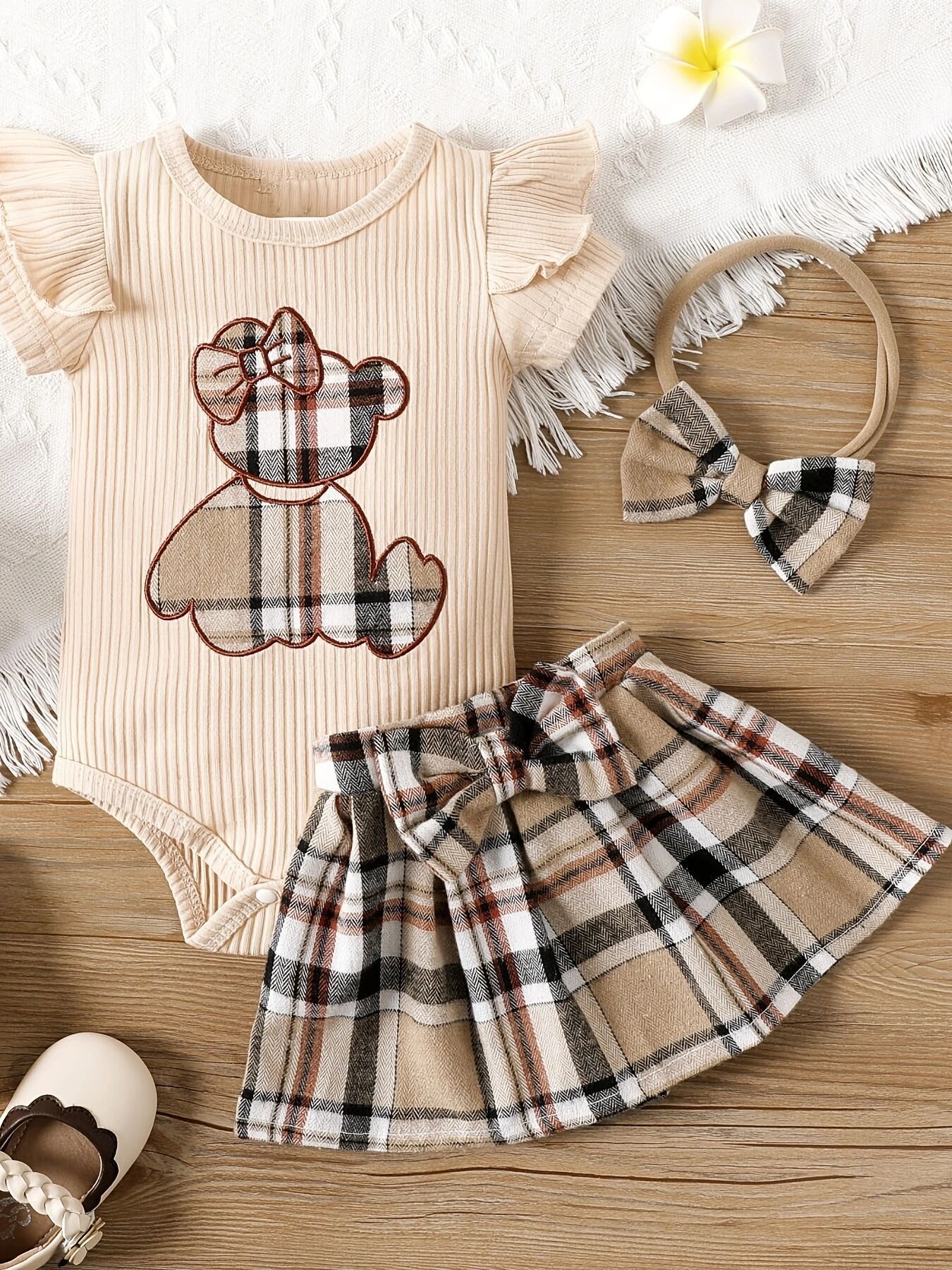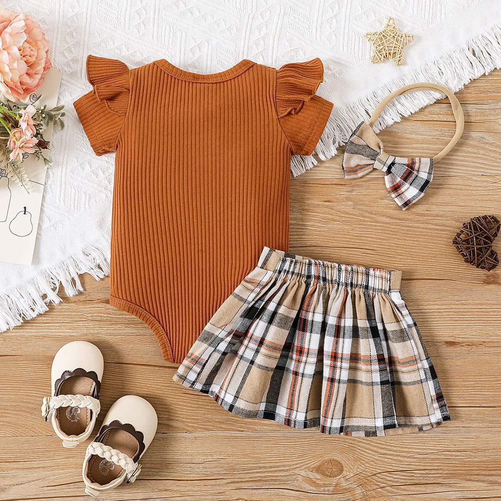 Newborn baby fart triangle Romper girl plaid skirt summer bear two-piece set